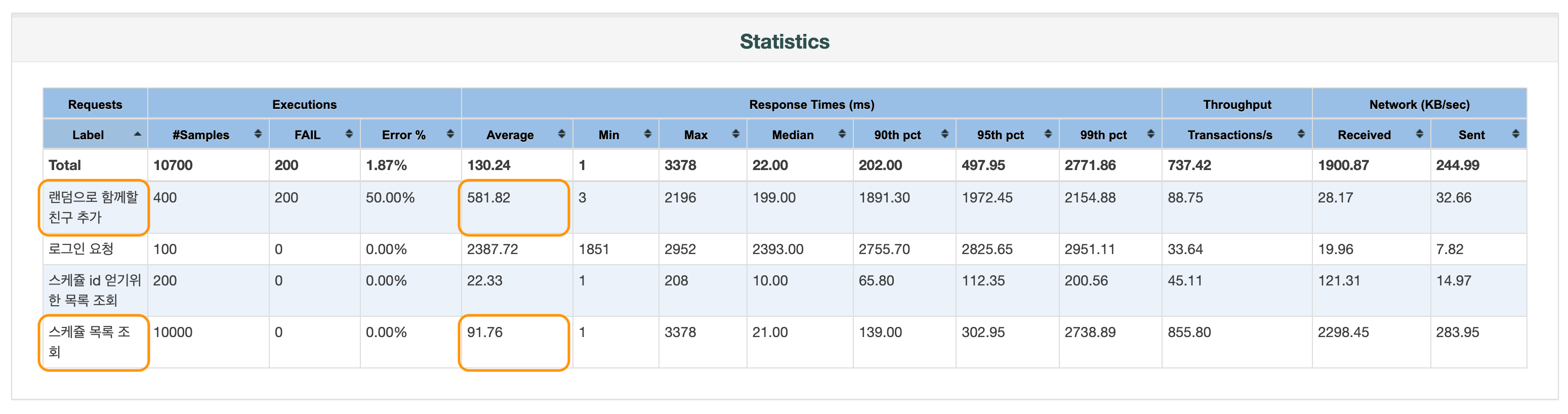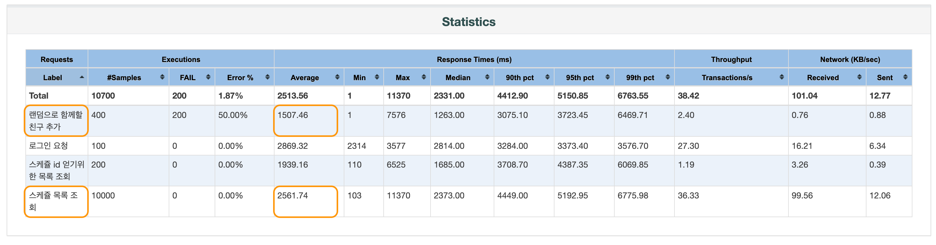 테스트 중 발생한 에러는 1 - 1000 사이의 id 중 랜덤하게 택한 id를 갖는 회원을 함께할 친구로 추가할 때 이미 함께할 친구로 지정되어 있어서 발생하는 오류로 우선 무시하고, 스케쥴 목록 조회와 함께할 친구 추가에 소요된 평균 시간을 확인했다. 각각 2561ms, 1507ms로 측정되었다. 즉, 평균적으로 목록을 조회하는데 2.5초가 걸렸다는 의미이다. 빠르다고는 할 수 없는 시간이지만 다른 결과가 없어 비교하기가 어려워 우선 나머지 항목들도 마저 측정해보았다.