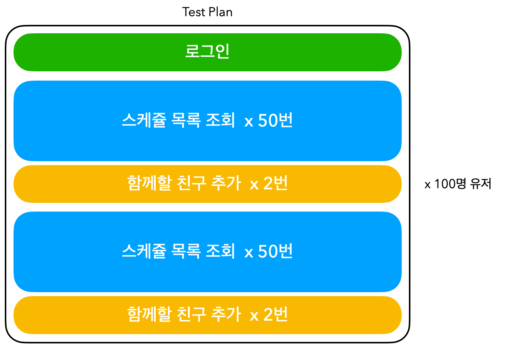간단히 설명하면, csv 파일에 작성된 회원 닉네임과 비밀번호 를 읽어 로그인을 수행하고 (HTTP 쿠키 매니저를 통해 사용자별 쿠키를 유지) 각 회원 별로 스케쥴 목록 조회를 50번 수행하고 함께할 친구 추가를 2번 수행하는 과정을 총 2회 반복한다.