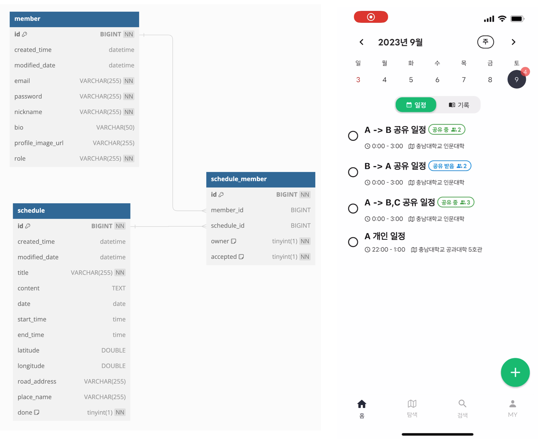 앞서 이야기한 '일정 목록 조회 시 일정에 참여하는 회원 수 함께 조회' 라는 문제를 해결하기 위해 먼저 기존 테이블대로 정규화를 유지하고 매번 일정 목록 조회 시 마다 일정(schedule)에 해당하는 일정 회원(scheduleMember)이 몇 개가 존재하는지 애플리케이션에서 추가 쿼리를 날리는 방법을 생각해봤다.