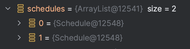 참고로 @Lock은 distinct와 같이 사용할 수 없다고 한다. 동시에 사용하려고 하면 InvalidDataAccessResourceUsageException 이 발생한다. 하지만 JPQL에서 distinct 키워드를 사용하지 않으면 일대다 관계에서 다쪽 row의 개수 만큼 일쪽 엔티티가 뻥튀기(?) 되는 잘 알려진 문제가 있다. distinct를 빼고 다시 실행해보니 예외가 발생하지 않고 동작은 잘 했지만 확인해보니 반환 타입이 List<Schedule> 로 되어있는 경우 역시나 ScheduleMember의 개수만큼 동일한 Schedule 객체가 리스트에 중복되어 포함되는 것을 확인할 수 있었다.